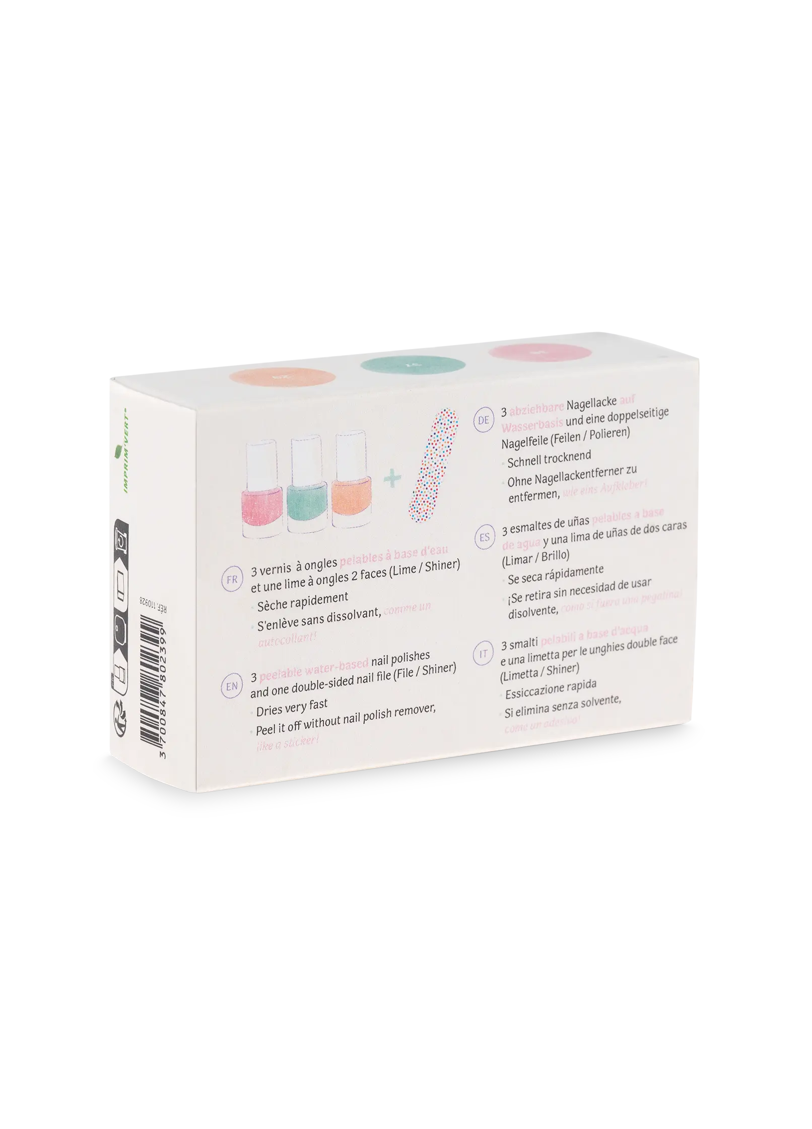 ფრჩხილის ლაქის ნაკრები – დამზადებულია წყლის ბაზაზე, მავნე დანამატების გარეშე. მარტივად შორდება (არ საჭიროებს აცეტონს). დამზადებულია საფრანგეთში. 3 x 7.5 მლ.